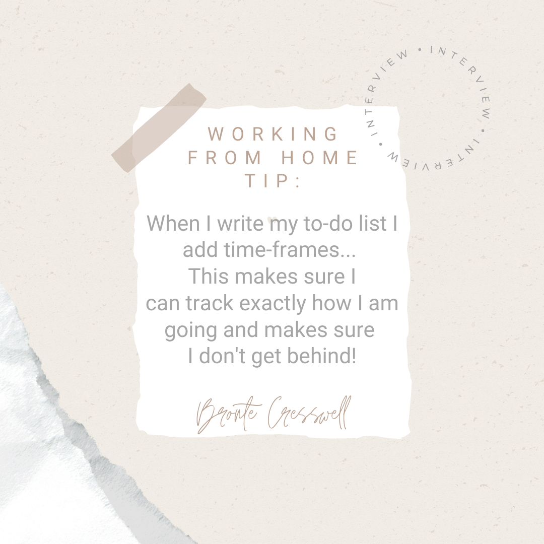The hardest part of working from home for me is distractions resulting in lack of productivity, so when I write my to-do list I add time-frames to them, such as inbox cleared by 9:30am, client social schedule drafted by 11:00am and lunch at 12:30pm. This makes sure I can track exactly how I am going and makes sure I don’t get behind!